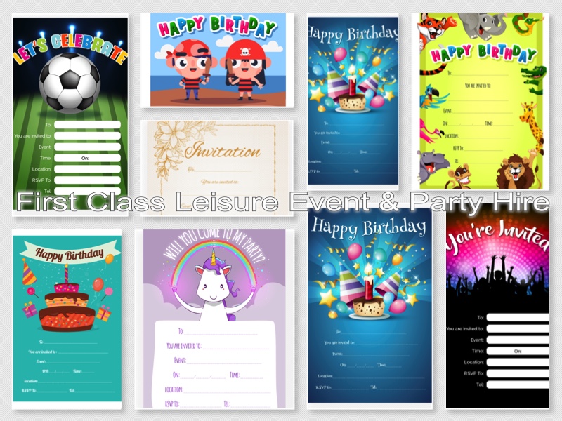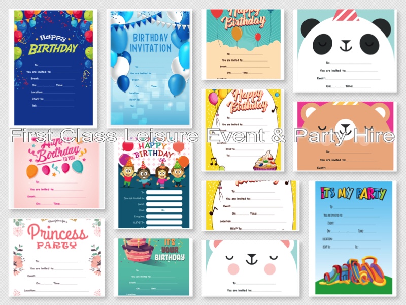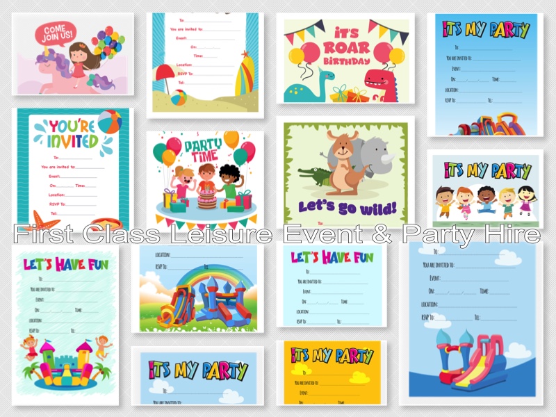 Book ANY equipment with First Class Leisure Event & Party Hire and use own FREE downloadable party invitations for your event. These ready to print invites are available FREE to download to your own computer (JPEG and PDF formats) so making it easy to print your own invitations and saving you lots of time and money.