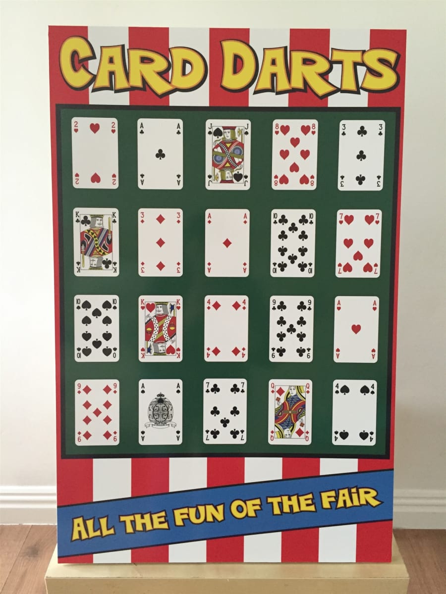 Card Darts side stall game Card Darts is a traditional fairground classic and a great game for all ages, perfect attraction for all fayres, fetes, fundraising, fun days, schools, home events, corporate, community events, parties.... How to play the card darts game: This game can be played in many different ways, try to hit 3 cards, hit 2 cards or just hit 1 card, or try and hit a specific card of your choice with the 3 sucker darts to win the prize or make up your own game to suit your event, all games sound easy, but they are more challenging than they sound and very addictive. Great fun for all ages 3+ We manufacture and sell side stall games - For more details visit our sales website www.midlandleisuresales.co.uk