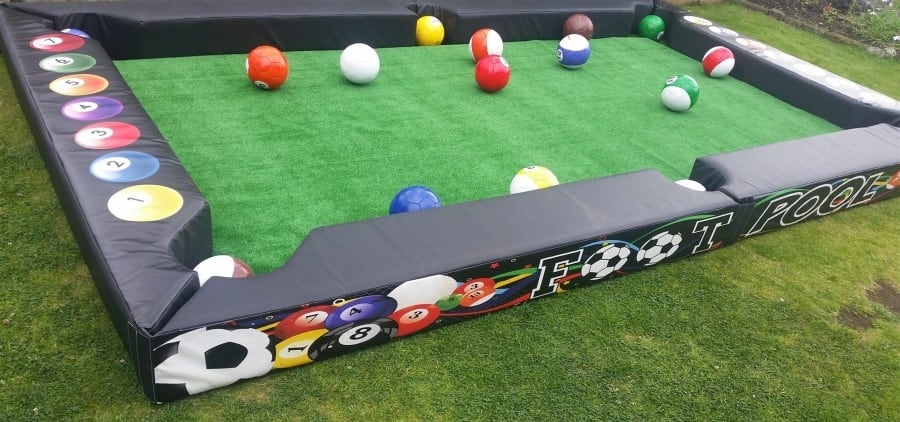 Footy Pool (Soccer Pool) is a giant version of pool but there are no cues. To play the game you use your feet to kick the size 5 footballs on the grass astroturf flooring, your own feet become the cue. The footy pool game 15.41ft x 8.58ft is smart and impressive and ideal for corporate events, schools, freshers week, Uni’s, fun days, team building, football events, football teams, clubs, promotional events and lots more. Practice makes perfect, screw back and swerve shots are still possible. You will require a flat minimum floor space 18ft L x 10ft W to play this game. This game can be played two player or multiplayer by taking turns in teams. How to play: Footy pool is the same game rules as the traditional games table pool, but with footy pool you actually stand on the ‘astro turf’ footy pool table to play and kick the white ball against the balls to knock them into the pockets. Choose which player or team is spots or stripes and flip a coin to see who breaks, then kick the white ball to break the balls (just like pool). Player or team member one kicks the white ball to try to pot a spotted ball, player or team member two then kicks the white ball to try to pot a striped ball. When all your spots or stripes have been potted then move on to the black ball to win the game.