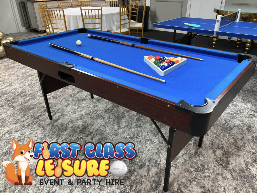 Hire a pool table for your home event, party or social fun with friends. Table Size: 6ft x 3ft x 2.58ft H Supplied with: Pool Balls (1 7/8 Inch), 2 x 48 inch 2 piece cues, triangle and chalks Please note these pool tables do not have any table markings. Mahogany finish pool table, with dual central ball return system and good quality cushion response. Our pool tables are available to hire within a bar and pub package. Pool tables are great for all events, corporate fun, company fun days, networking, reward days, team building, schools, office parties, sports clubs, sports days, weddings, home parties and other special events. If you are looking for a different kind of pool game then why not hire our Footy Pool Action Game it’s exactly the same rules as table pool but instead of using a cue, you use your feet, its great fun for all ages. For smaller functions and spaces, why not try hire our 3ft table top games tables