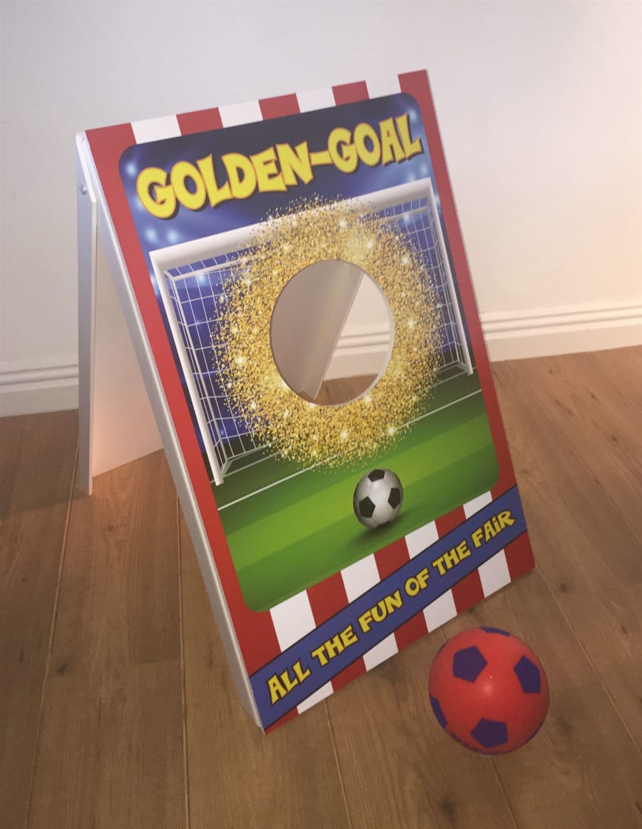 Golden Goal Football Side Stall Game Golden Goal Game is a great sporting game for all ages and a perfect attraction for all football sporting events, home events, corporate events, trade stalls, schools, fayres, fetes, fundraising events, fun days, community events and lots more.... How to play Golden Goal Football Game: The object of the game is to try to kick the soft foam ball into the golden hole to win a prize, it sounds easy, but it’s more challenging than it sounds and very addictive. We recommend placing the football tee approx 160cm away from the game board and to kick the ball slow and gentle movement. Great fun for all ages 3+