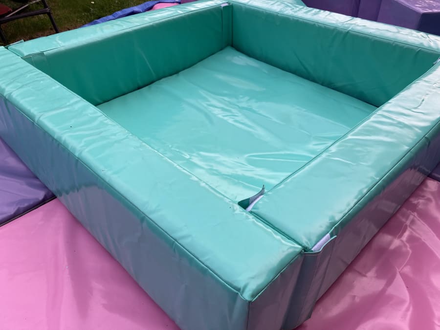 Large padded soft play mat approx 3m x 3m 4ft Pastel soft ball pool, filled with crystal clear play balls Soft play shapes set appox 18 pieces in different shapes Colours may vary - pastel colours, pink, mint green, sky blue and lilac colours.