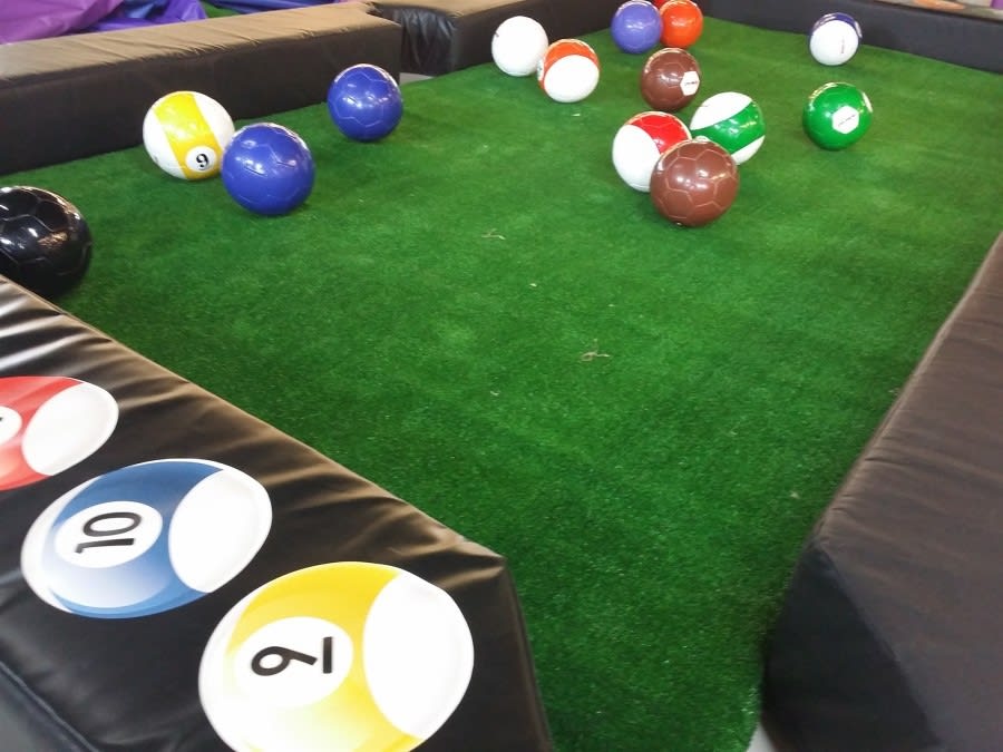 Footy Pool (Soccer Pool) is a giant version of pool but there are no cues. To play the game you use your feet to kick the size 5 footballs on the grass astroturf flooring, your own feet become the cue. The footy pool game 15.41ft x 8.58ft is smart and impressive and ideal for corporate events, schools, freshers week, Uni’s, fun days, team building, football events, football teams, clubs, promotional events and lots more. Practice makes perfect, screw back and swerve shots are still possible. You will require a flat minimum floor space 18ft L x 10ft W to play this game. This game can be played two player or multiplayer by taking turns in teams. How to play: Footy pool is the same game rules as the traditional games table pool, but with footy pool you actually stand on the ‘astro turf’ footy pool table to play and kick the white ball against the balls to knock them into the pockets. Choose which player or team is spots or stripes and flip a coin to see who breaks, then kick the white ball to break the balls (just like pool). Player or team member one kicks the white ball to try to pot a spotted ball, player or team member two then kicks the white ball to try to pot a striped ball. When all your spots or stripes have been potted then move on to the black ball to win the game.