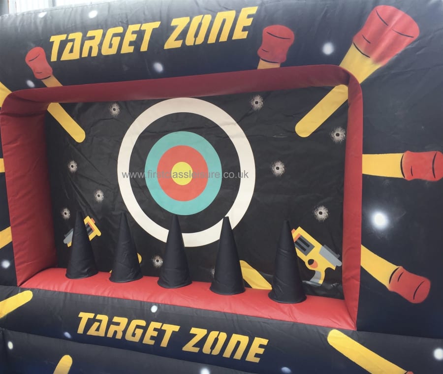 Everyone will love the battle zone target shooting game, it’s brilliant fun and perfect for any event. The target balls will be floating above the 5 air jugglers, you need to try to shoot the balls in mid-air, it's great fun and very addictive. Size approx: 8.85ft W x 6ft L x 6.72ft H Colour: Black and Red This game is recommended for Indoor hire. For outdoor hire the game must be set-up in a sheltered enclosed area, away from wind to stop the balls flying away. This item will not work in windy conditions, because the balls have to float on top of the air vent blowers. Comes complete with safety eye protective glasses, 2 x shooters and plenty of soft foam darts. The foam darts are designed with safety in mind, but should never be aimed at a person and only used for the game purpose only. Protective glasses are designed for a comfortable fit and have an adjustable elastic strap. Great fun for all occasions, schools, clubs, birthday parties, christenings, team building, community days, weddings, anniversaries and all other occasions.