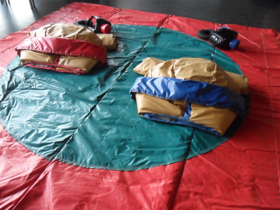Sumo Suit Hire (Adult Set) - Recommend for ages 12+ This set is supplied with two soft padded sumo suits, one 12ft x 12ft padded safety mat and protective safety helmets and neck braces. Suits are soft foam packed to give you the look of a hugh Japanese wrestler and helmets in the traditional design of the sumo haircut. Sumo suits are a two player game, fantastic fun and very popular. The object of the game is to either push, trip, throw, pull or force your opponent out of the coloured circle on the thick, padded sumo mat provided, best of 3 wins! You can also try to force your opponent onto their back and ''splatting'' your fallen opponent in the Japanese way. No power is required for this item. We clean our suits at the start and at the end of every event. Junior Suits are recommended for ages 5-11 years If you hire sumo suits and junior super hero suits only one mat will be supplied.