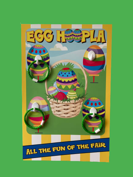 Hire our amazing Egg Hoopla game for some Easter fun activities. This game is a perfect attraction for all home parties, fayres, fetes, fundraising, fun days, schools, home events, corporate, community events, parties.... How to play Egg Hoopla Game: The object of the game is simple, try to get the coloured rope hoops onto hooks to win! it sounds easy, but it’s more challenging than it sounds and very addictive. Great fun for all ages 3+ Egg Hoopla - We manufacture and sell side stall games - For more details visit our sales website www.midlandleisuresales.co.uk
