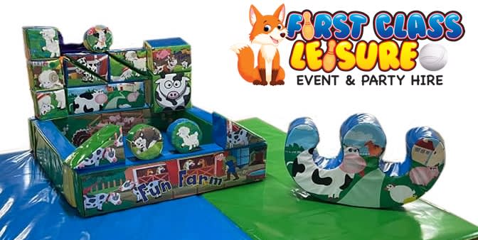 Are you having a farm themed event? then why not hire or amazing farm soft play, ball pool and rocker package set. This package Includes one 15 piece soft play set with beautiful farm themed artwork and one 5ft x 5ft soft padded ball pool with matching artwork and one soft play rocker. This set is perfect for all farm themed parties and events. THIS PACKAGE IS FOR INDOOR VENUES or OUTDOOR UNDERCOVER ONLY MARQUEE OR GAZEBOS WITH COVERED FLOORING ONLY. Why not add other farm themed items to your event, to keep all the children entertained. Farm Yard, Farm Yard Midi Bouncer 4m x 3m, Play Zone Farm Yard Inflatable Outdoor Hire