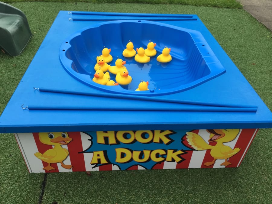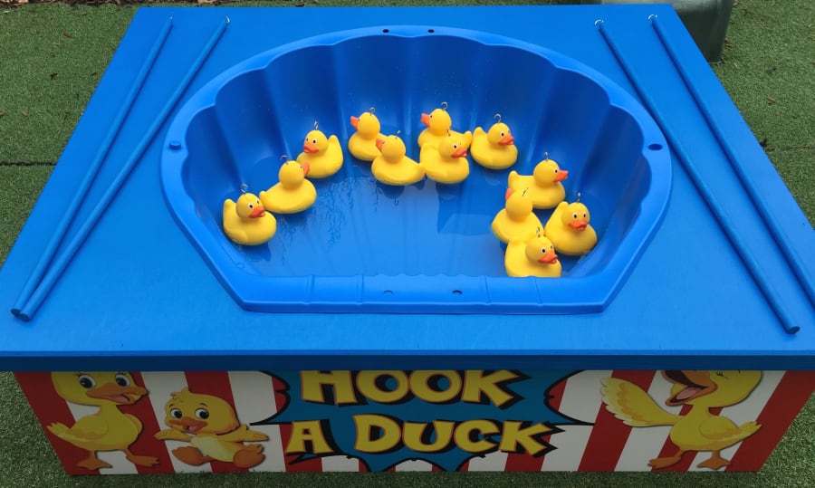 Hire our Hook a Duck game for your next event. This traditional fun fair game is great fun for all ages, even adults! great for parties, schools, fetes, fayres, church, village halls, home events, community days and all fundraising events. How to play: Up to 4 participants can play at any one time. Each player takes a fishing hooking rod and tests their skill to try to catch the cute yellow float upright ducks floating on the water. For fetes and fund raising events this game can also be played in lots of other different ways to generate funds for your event. Hook a Duck is recommended for outdoor use. It can also be set-up and used indoors, with strict adult supervision and plenty of towels ready to wipe away any excess water. Our hook a duck game has been designed and manufactured by our sister company Midland Leisure Sales and available to hire or sale, to buy Hook a Duck Ducks & Fishing Rod Stick CLICK HERE