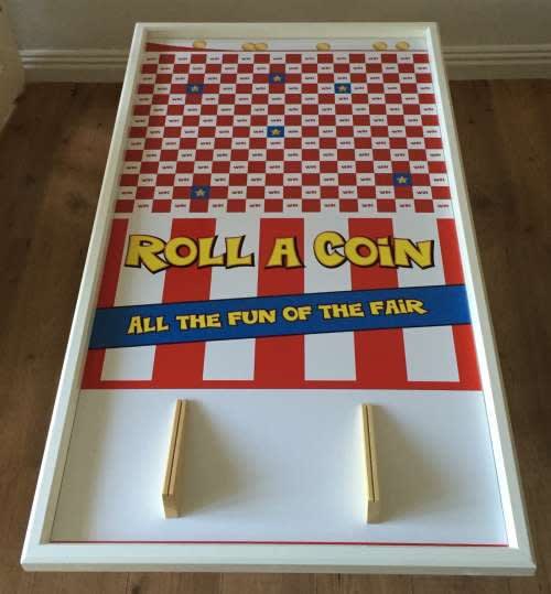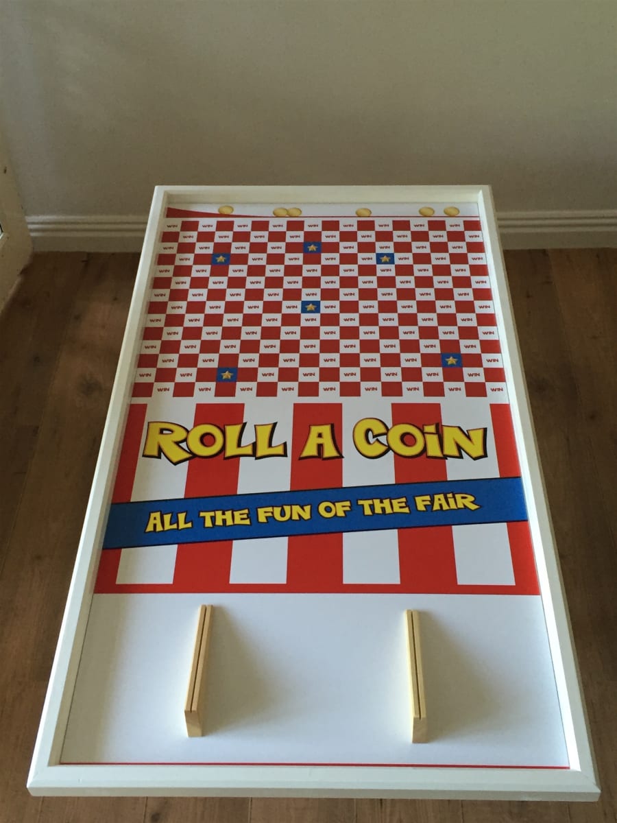 Roll-a-Coin Game Table top traditional favourite at all fundraising events! People really enjoy testing their skill at the traditional roll-a-coin table top game. Roll-a-Coin is a fete classic and a great game for all ages, perfect attraction for all fundraising events, fayres, fun days, schools, churches, community days and lots more. How to play Roll-a-Coin Game: Participants try their luck and test their skill by rolling coins down the wooden chutes, try to get the whole coin into a white WIN square to win a prize or even get your money back. Get your coin in the blue squares with a gold star to win a better or bigger prize, if your coin falls into the red squares or even on the lines then you lose your coin. It’s great fun and sounds easy, but it’s more challenging than it sounds and very addictive. Game board frame is approx 5ft L x 3ft W See our Furniture Page if you need to hire a table for this game. Roll-a-Coin game is suitable for all ages 3+ with adult supervision. Can be used both Indoors and Outdoors (weather permitting/under cover). Hire or Buy Roll a Coin game sheets and wooden shutes