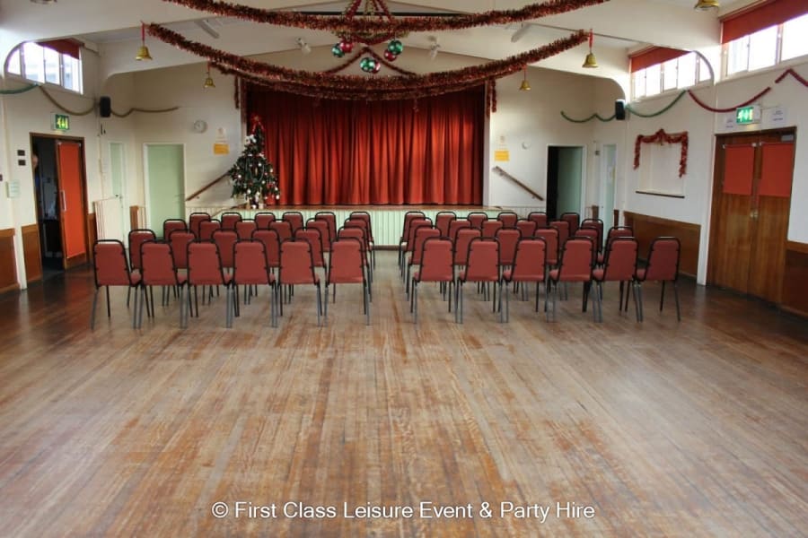 The Main Hall is suitable for parties and functions and is licensed for up to 150 people and will accommodate 100 people seated at tables for a formal meal, or 150 seated in rows for lectures or meetings. Large and small tables and chairs are provided. The Main Hall overall floor area measures approximately 12.8 metres by 9 metres (42 feet by 29 feet)