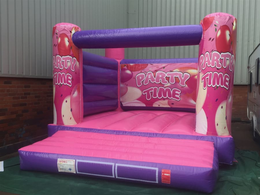 Party Time Theme Bouncy Castle - For Outdoor Hire This open front H frame bright coloured eye catching bouncy castle, in the lovely party time pink design, has a large bouncy bed making it perfect for all types of events, birthdays, parties, christenings, weddings, home parties, schools, fun days, church groups and much more. For extra safety this bouncy castle has high side walls, so users are not able to climb over the back and sides. Our bouncy castles are modern, have real good bounce and easy for users to climb on and off safety. The unisex artwork hero design is very popular and suitable for boys and girls up to 1.5m tall. To Book This Bouncy Castle For Indoor Hire - Click Here