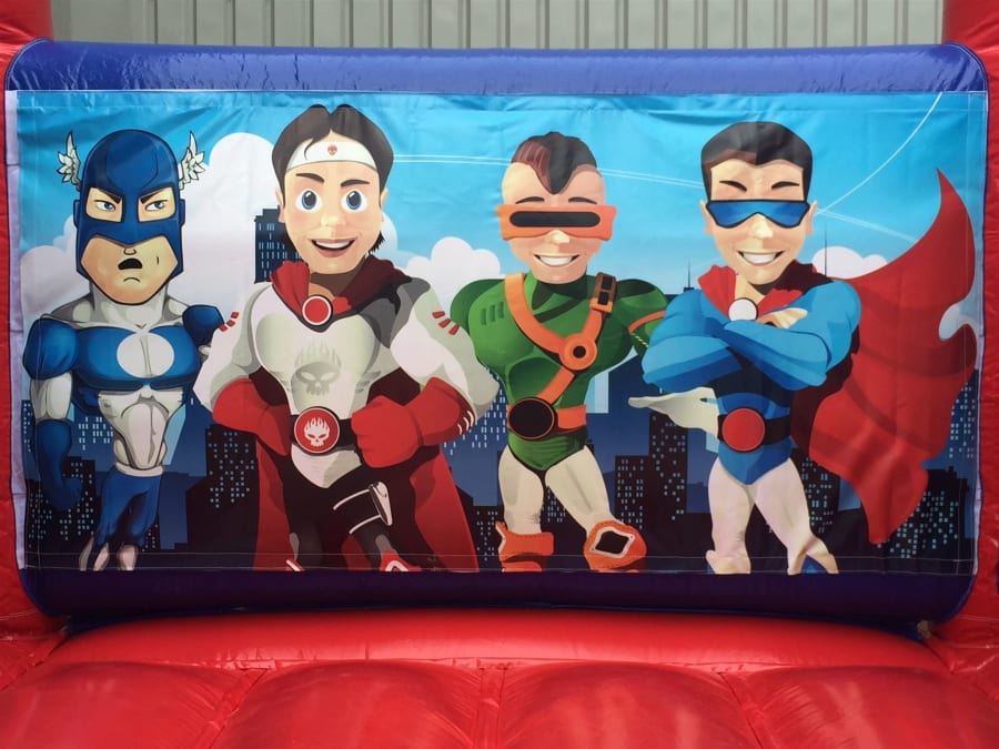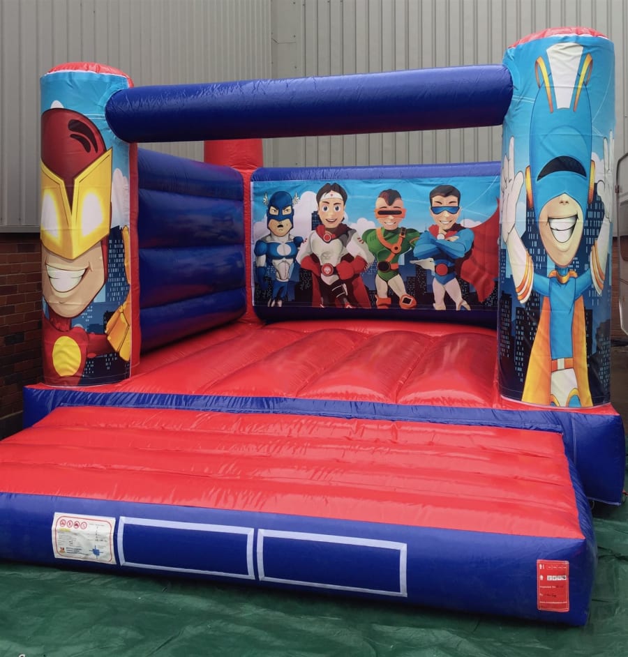 Hero Theme Bouncy Castle Blue/Red - For Indoor Hire This open front H frame bright coloured eye catching hero design bouncy castle, has a large bouncy bed making it perfect for all types of events, birthdays, parties, christenings, weddings, home parties, schools, fun days, church groups and much more. For extra safety this bouncy castle has high side walls, so users are not able to climb over the back and sides. Our bouncy castles are modern, have real good bounce and easy for users to climb on and off safety. The unisex artwork hero design is very popular and suitable for boys and girls up to 1.5m tall. To Book This Bouncy Castle For Outdoor Hire - Click Here