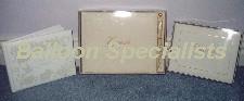 Guest Books are a must have item for your special day. These lovely books are available in many different designs, colours and sizes, we have listed some details below but styles and designs may vary. Small Bridal Bells Guest Book Space for over 575 guest entries, approx size 7.5" W x 5.5" T) Small Classic White and Gold Guest Book Sspace for over 500 guest entries, approx size 7.5" W x 5.5" T Large Classic Ivory & Gold Guest Book with Pen Space for over 975 guest entries, approx size 10" W x 7” T Designs/styles/colours may vary