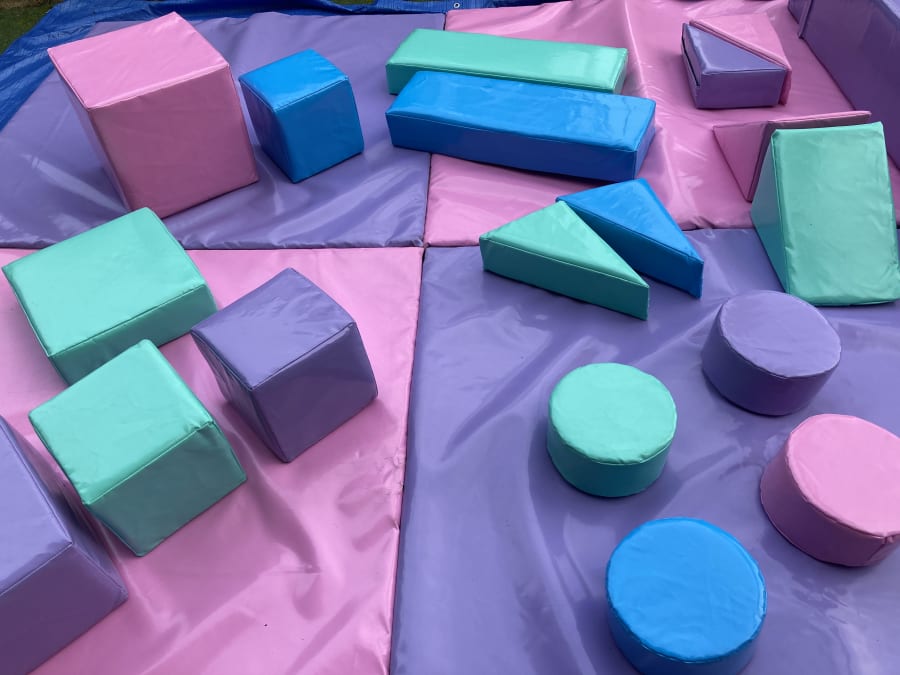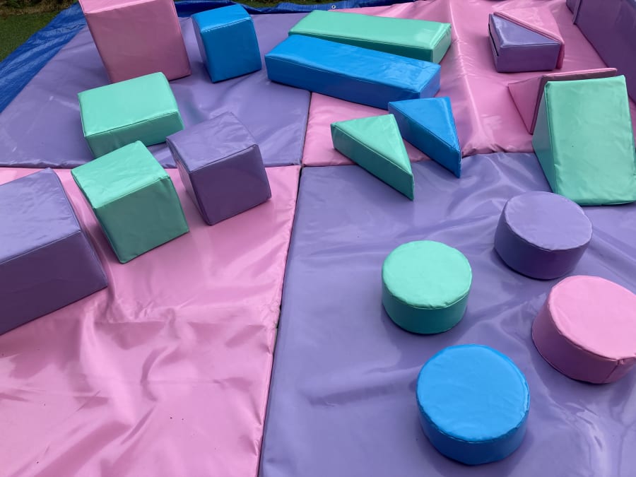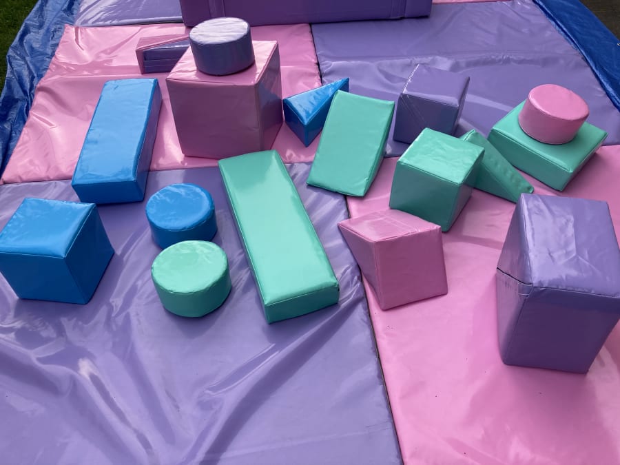 Large padded soft play mat approx 3m x 3m 4ft Pastel soft ball pool, filled with crystal clear play balls Soft play shapes set appox 18 pieces in different shapes Colours may vary - pastel colours, pink, mint green, sky blue and lilac colours.