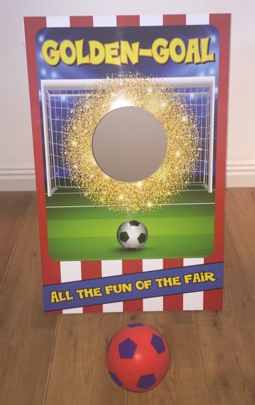 Golden Goal Football Side Stall Game Golden Goal Game is a great sporting game for all ages and a perfect attraction for all football sporting events, home events, corporate events, trade stalls, schools, fayres, fetes, fundraising events, fun days, community events and lots more.... How to play Golden Goal Football Game: The object of the game is to try to kick the soft foam ball into the golden hole to win a prize, it sounds easy, but it’s more challenging than it sounds and very addictive. We recommend placing the football tee approx 160cm away from the game board and to kick the ball slow and gentle movement. Great fun for all ages 3+