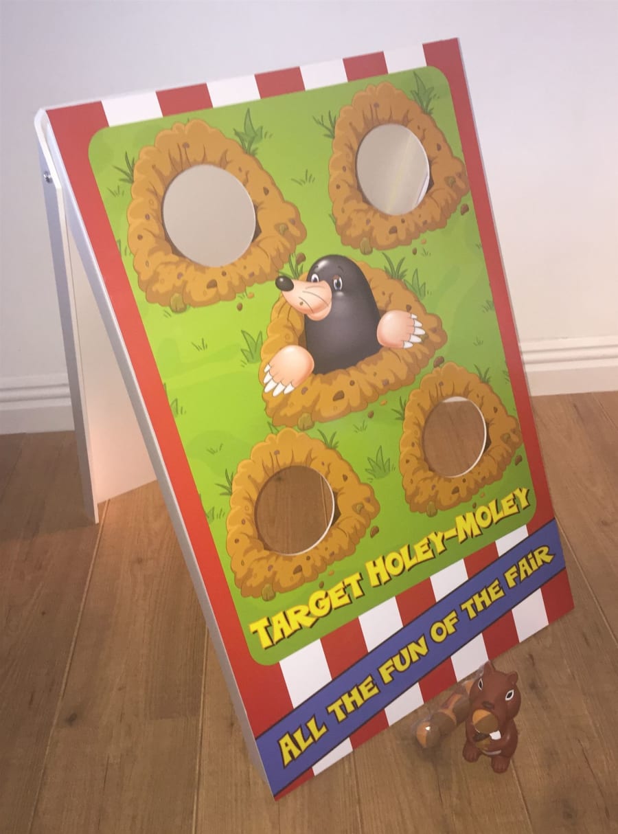 Target Holey-Moley Game Target Holey-Moley Game is a target shooting game for all ages and a perfect attraction for all events, corporate events, trade stalls, schools, fayres, fetes, fundraising events, fun days and lots more. How to play Target-Holey Moley Game: The object of the game is to try to shoot one (or two) foam balls into the mole holes to win a prize, it sounds easy, but it’s more challenging than it sounds and very addictive. We recommend standing approx 130cm away from the game board, take aim and squeeze the animal shooter to fire the balls. Great fun for all ages 3+