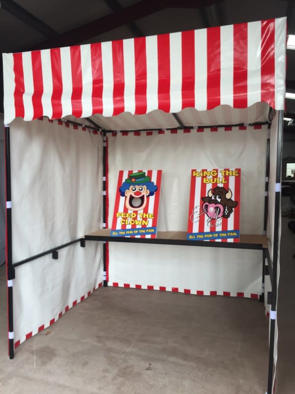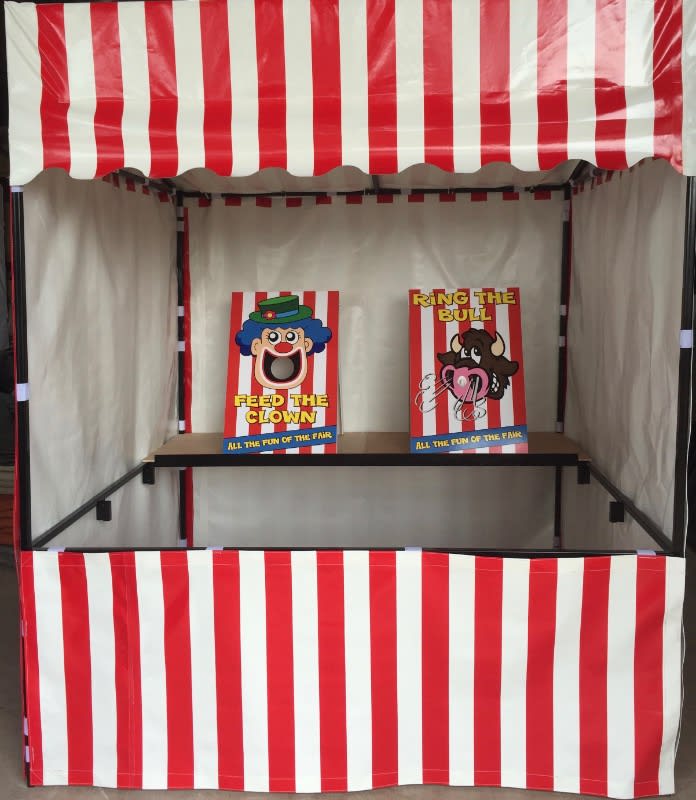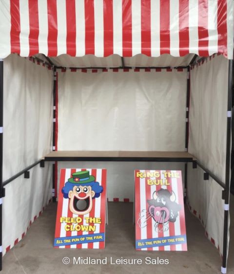 Are you looking to hire a professional side stall frame for your carnival event or circus themed event. This amazing strong side stall stand is available for lots of different events. Hire now for all fun fair carnival game attractions, home parties, celebrations, birthdays, weddings, anniversaries, fun fair home parties, circus events and all other events. Side stall stand size: 2m W x 1.8m L x 2.43m H Flame Retardant PVC Covers Add some of our fun carnival games to the side stall, to make a great attraction for all fetes and fundraising events and home fun carnival event. Look professional at your event and WOW your guests. Use our side stall to create and area for our delicious fun food popcorn, pick n mix stands, pick & mix sweet trays, candy sweet cart, candy floss, slush machines, serving catering side stall and lots more. Bring all the fun of the fair to your event and hire our traditional side stall games to go inside the traditional red and white carnival stand, we have lots of games available, our games are suitable for all age ranges so just perfect for family and community events. Side stall can be used for lots of side stall games to give a safe surround for throwing and shooting target games. Ideal for coconut shy stands, or child Friendly coconut stands, hoopla game, dart throwing games, target shooting games, crossbow target games. Side Stall frame is a strong construction and much heavier and study than gazebo structures. This side stall can be used for many different Indoor and outdoor events. Hire or Buy our carnival themed side stall games