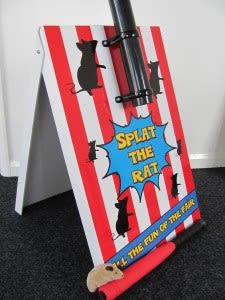 Splat The Rat Side Stall Game Splat The Rat is a traditional fairground classic and a great game, perfect attraction for all fayres, fetes, fundraising, fun days, schools, home events, corporate, community events, parties.... How to play splat the rat game: The object of the game is simple, the stall holder holds the rat by the tail of the top tube and then drops it. The participant tries to hit the rat with the bat as it comes out of the bottom tube to win a prize, it sounds easy, but it’s more challenging than it sounds and very addictive.