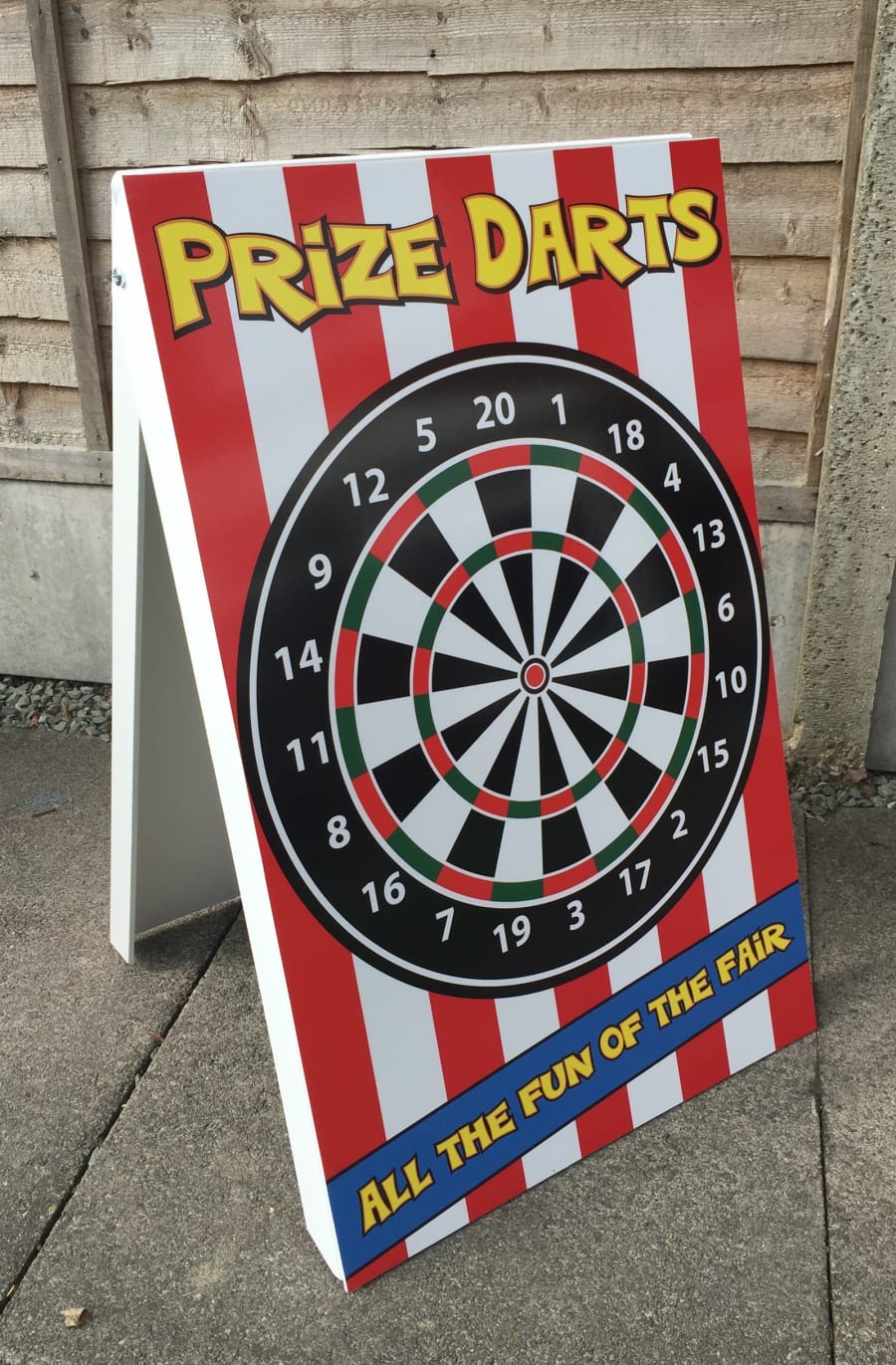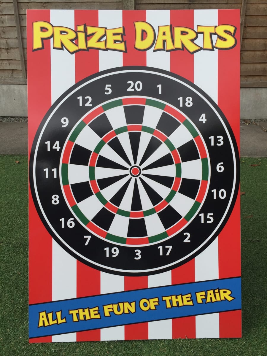 Prize Darts Fun Bow Side Stall Game Prize Darts is a traditional fairground classic and a great game, perfect attraction for all fayres, fetes, fundraising, fun days, schools, home events, corporate, community events, parties.... How to play the prize darts game: This game can be played in many different ways, try and score over 50 with the 3 sucker darts to win the prize, or try and hit the bullseye, or hit odd or even numbers or make up your own game to suit your event, all games sound easy, but they are more challenging than they sound and very addictive.