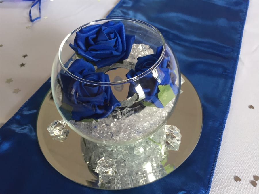 Fish bowls are also known as bubble bowls and make perfect table centrepiece. Each glass fish bowl comes decorated with crystal stones inside a glass tea light holder, with a battery powered tea light inside the holder to illuminate your function room and artificial flowers to match your colour scheme. Each glass bowl comes with a glass mirror plate with crystal sparkles decorations.