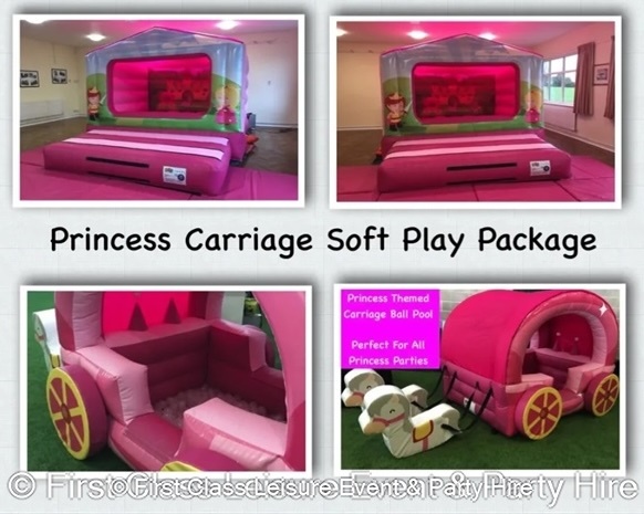 Princess Theme Package 4 THIS PACKAGE IS FOR INDOOR HALLS AND VENUES ONLY IMPORTANT: Please check the floor requirements before booking this package. Are you having a princess theme event? then why not hire or amazing princess soft play package. This package Includes a princess theme soft play set, princess themed bouncy castle, stunning princess theme carriage ball pond with soft play horses, this is an amazing package for any little princess. Princess Themed Bouncy Castle 14.5ft x 10.5ft x 7.5ft Princess Theme Carriage Ball Pond Hire Mats
