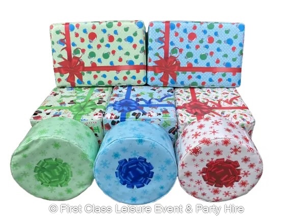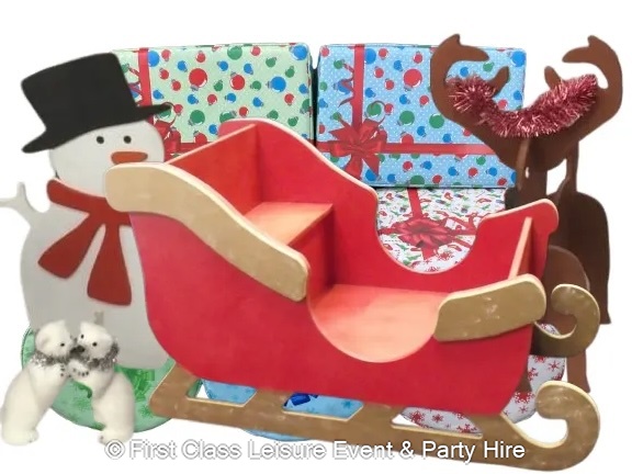 Santa Wooden Sleigh (1150mm L x 690mm H x 590mm W) Ideal to take those special photo’s moments to treasure. Sit on item - suitable for children only. Christmas Themed Presents - Soft Play Shapes (Set of 8) Display Props - These items are just for decoration purpose only. 2 x Wooden Reindeers (900mm H) 1 x Wooden Snowman (1000mm H) 1 x Polar Bears (Small)