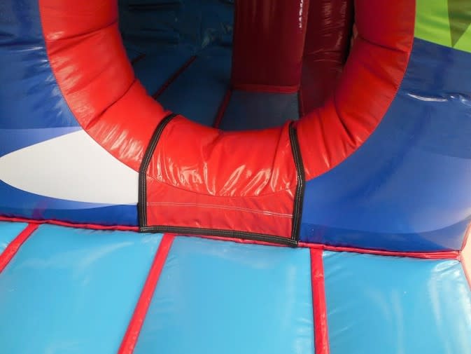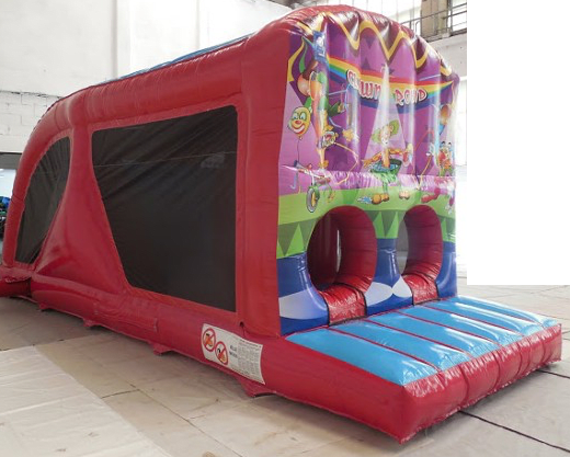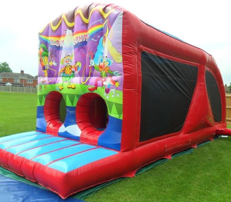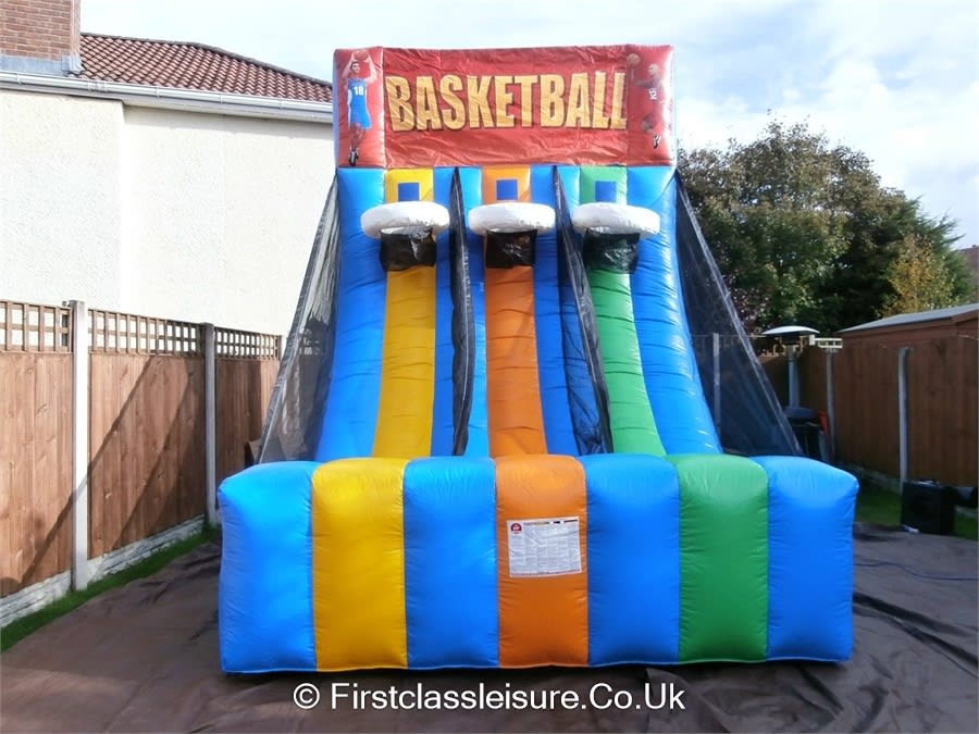 Basketball Shootout: Very impressive colourful inflatable with three basketball hoops which can be used at the same time, just reach over the inflatable front to retrieve the basket balls. Assault Course: Enter the front section, run the obstacles inside, climb the steps and finally down the slide, what a challenge! This is a great item to hire if you have lots of children to entertain at parties, schools, sports days, fun days, community and corporate events. Set-up area: We recommend enough clear space around the sides and ends, to ensure safe operation. Available all year round for both Indoors and outdoors events.