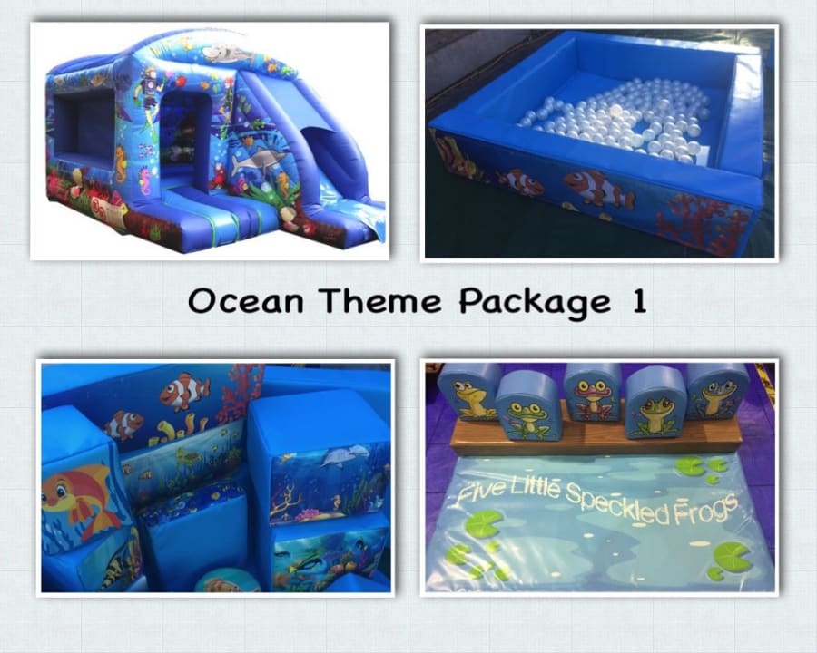 Ocean Theme Hire Package 1 Our ocean underwater sea theme package is a great package for all children and also very popular. Our amazing bouncy castle slide combination has very eye catching themed underwater design, with our amazing sea design soft play shapes set and sea theme ball pond with clear balls to give a clear water effect, Jump n Slide Ocean Ocean Soft Play Set Ocean Soft Play Ball Pool 5 Frogs On Log Soft Play Set Mats Image shows the ball pond with only a few play balls inside, there will be more balls supplied with this item. This package offers a good selection of products suitable for toddlers and smaller children, giving toddler children and older children lots of fun.